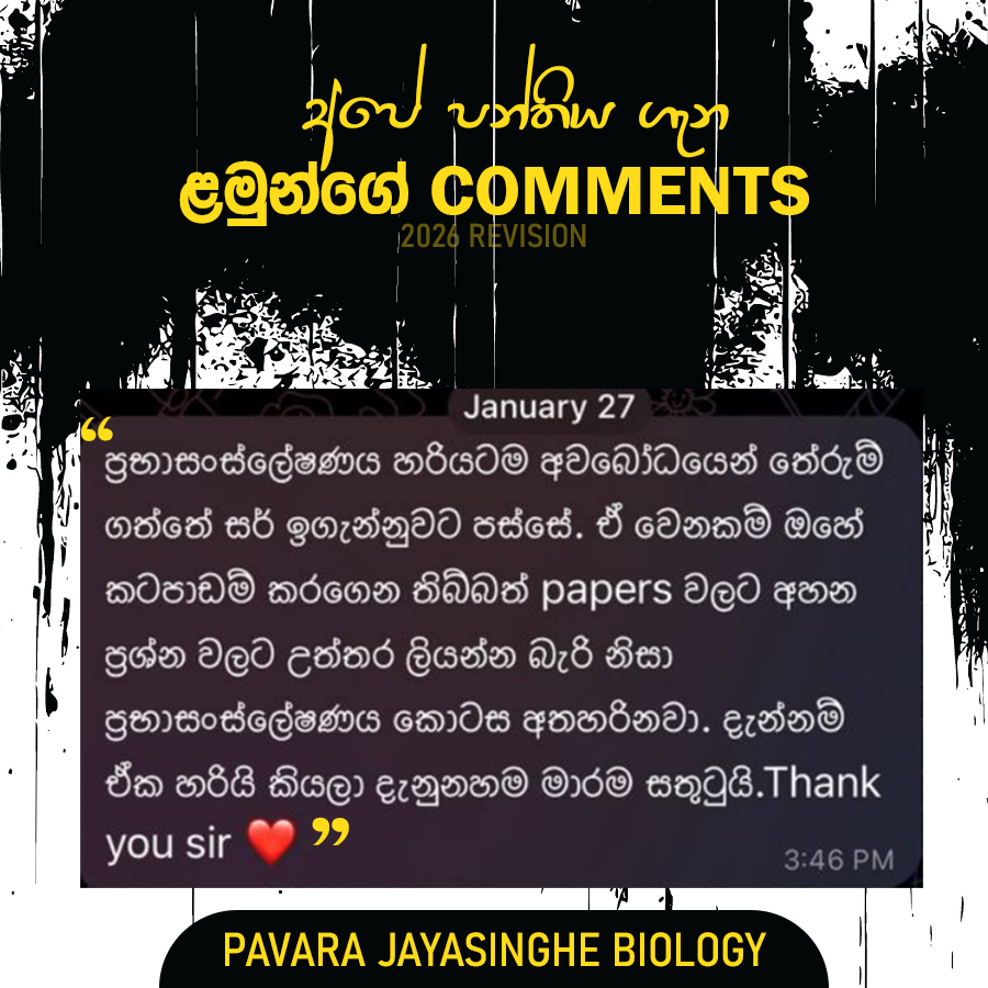 පළමු අවස්ථාවෙන්ම A සාමාර්ථයක් ලබා ගැනීමට අවශ්යවන හොඳ අඩිතාලමක් සහිත අංගසම්පූර්ණ විශය නිර්දේශය උගන්වයි. වාර විභාග වලදීද උපරිම ලකුණු ලබාගත හැකිවන පරිදි ප්රශ්නපත්ර ලිවීමට මනාව පුරුදු කරයි.